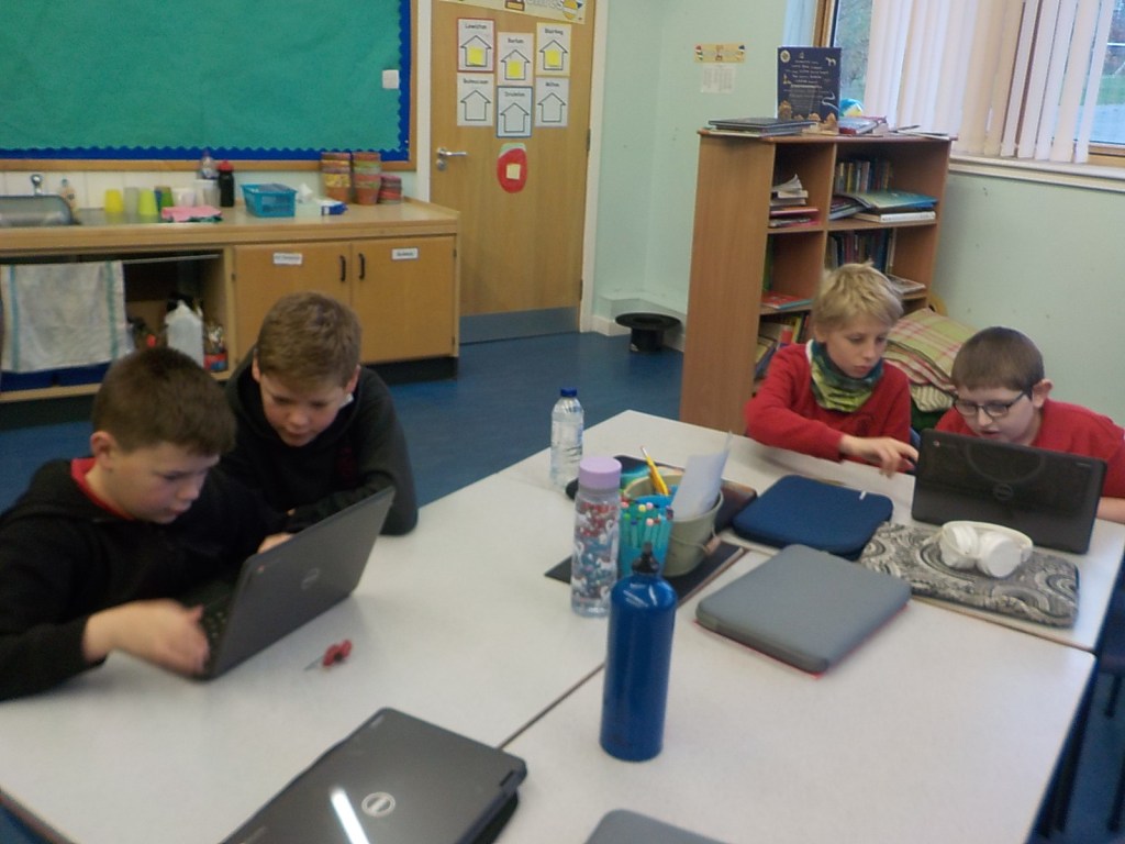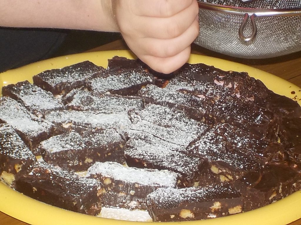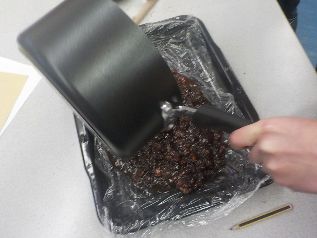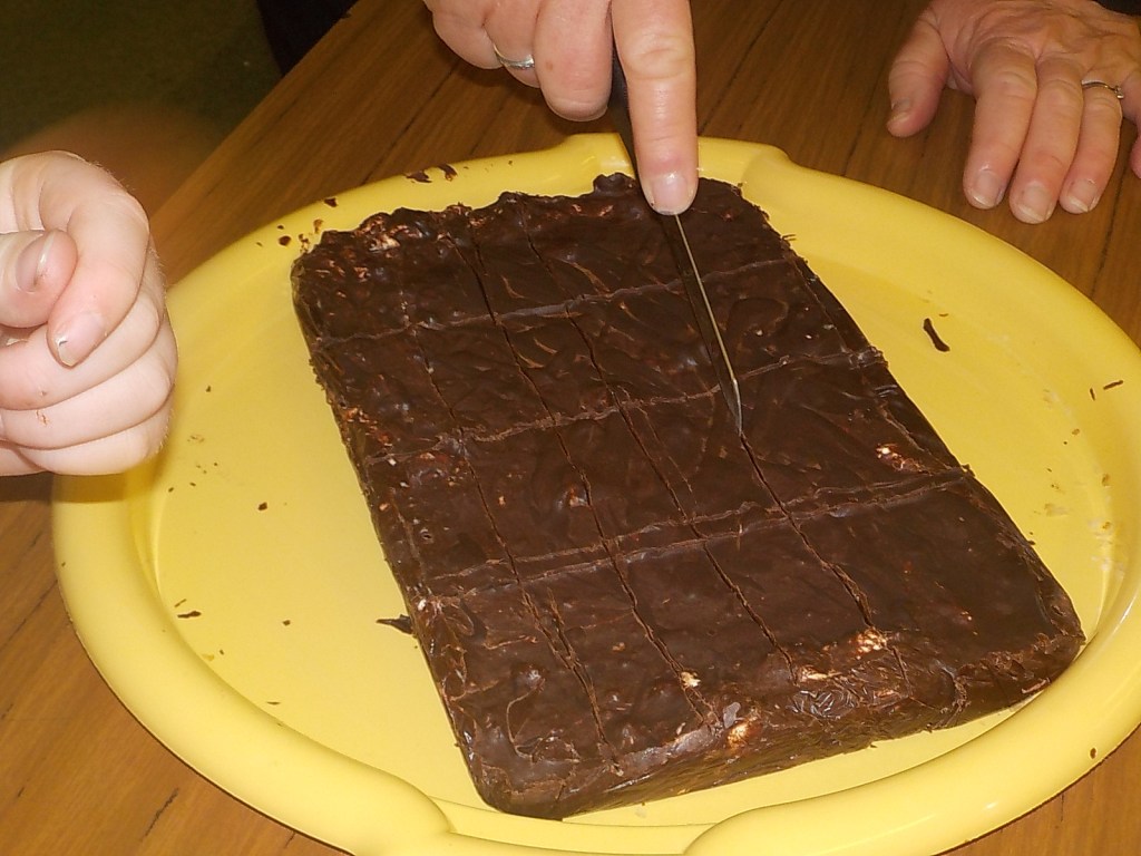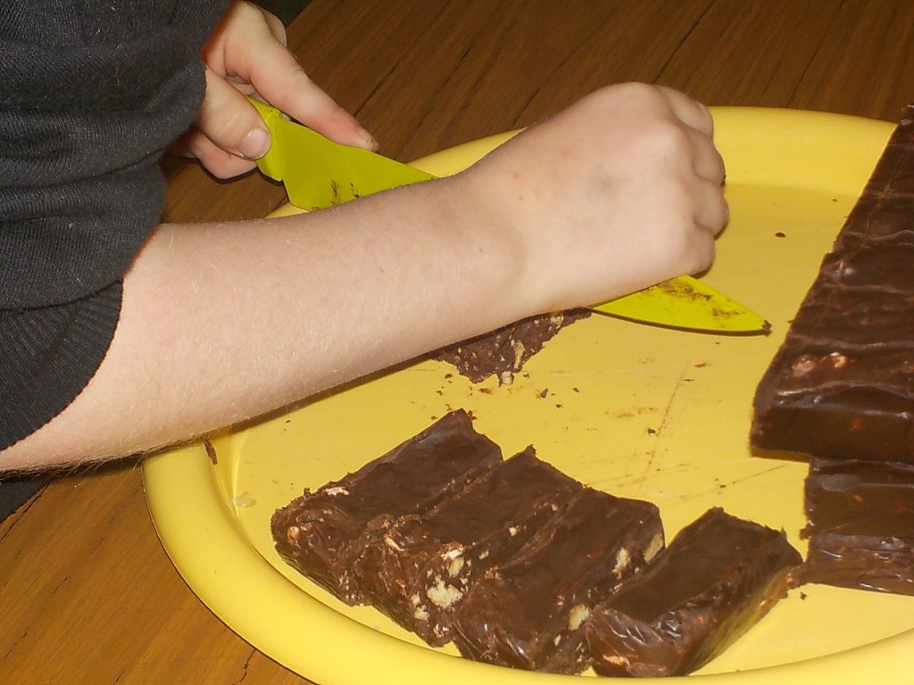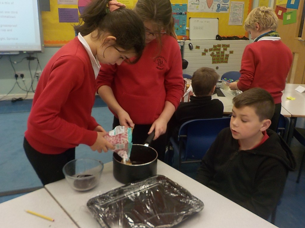 Last Tuesday and Wednesday, the P7s worked in their cooking groups to make Dairy Free Rocky Road. Thanks to Mrs Russell’s help and advice, it was a success and we all enjoyed a piece on Wednesday playtime. We all agreed that the trickiest part is bashing up the biscuits – you want to end up with chunks of biscuit through the mixture (not powder) but it’s so tempting to use the rolling pin a lot! After being involved with making it, the P7s wrote up their own individual versions of the recipes last Wednesday (13th November.)