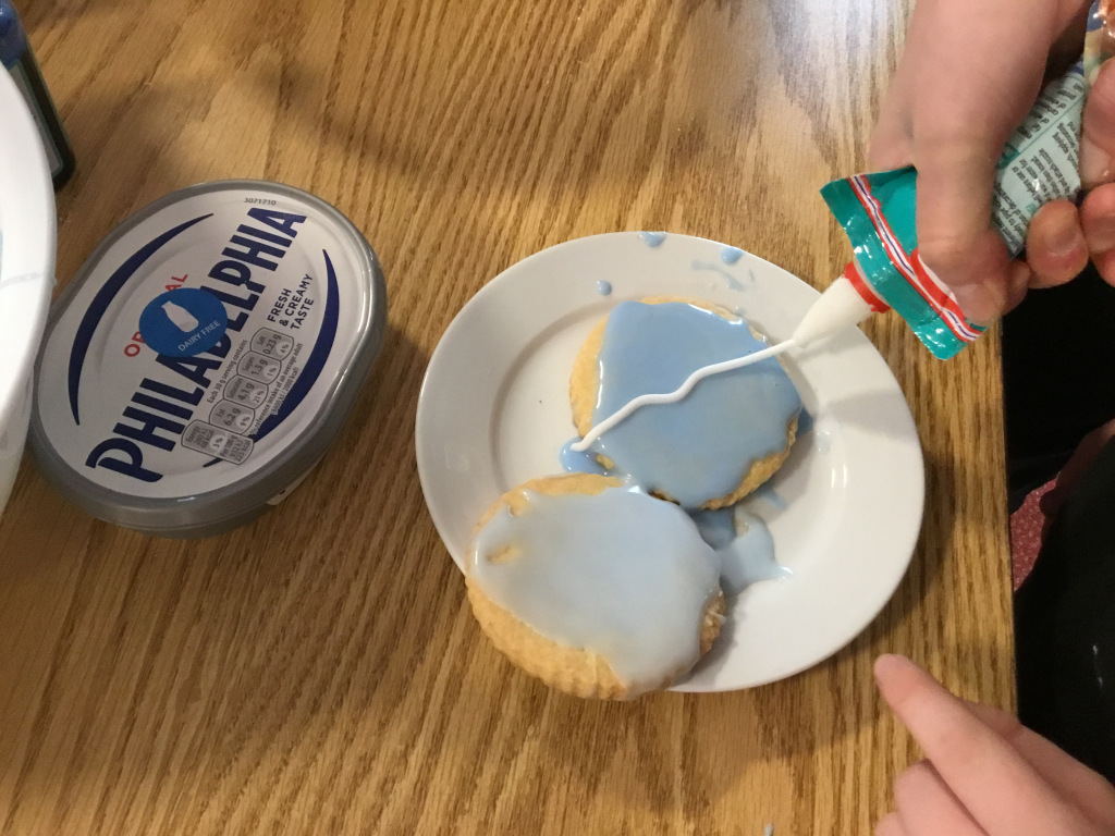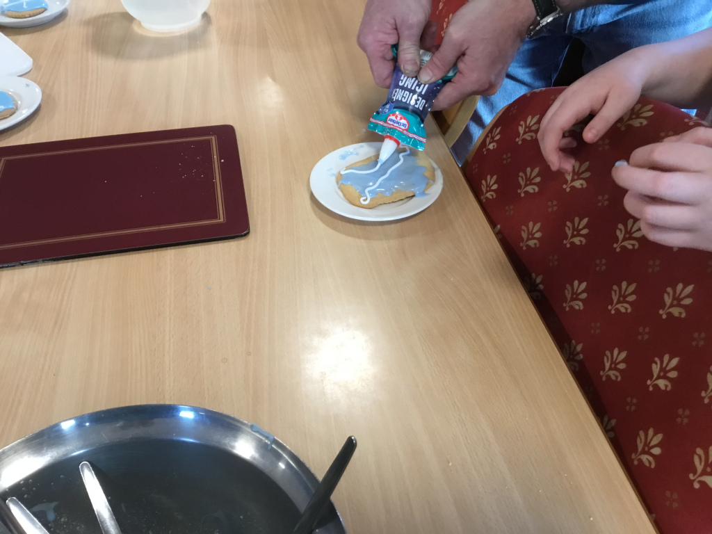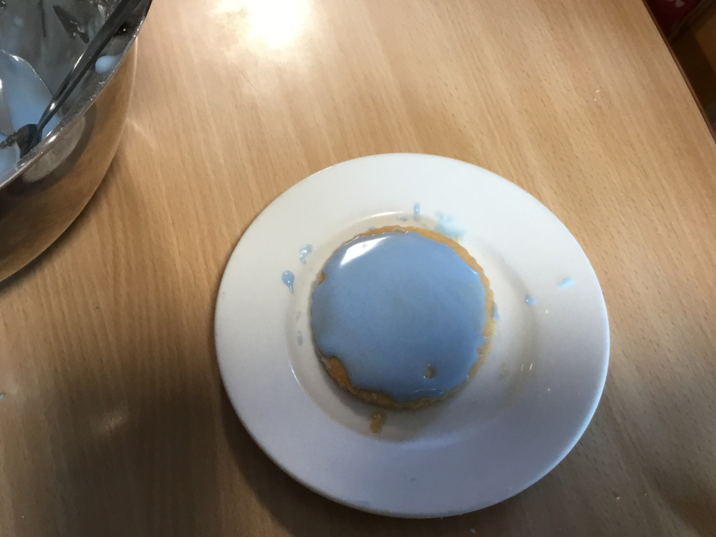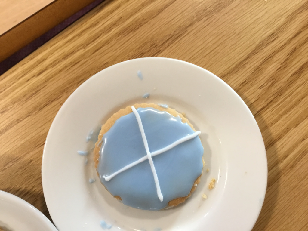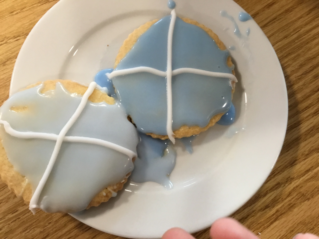 We learned a lot of lessons about how to make blue icing: you need a lot of icing sugar but hardly any water! Eventually, thanks to some kind helpers, we got the icing to work. Putting the white cross on was a lot harder than it looks in the photos!