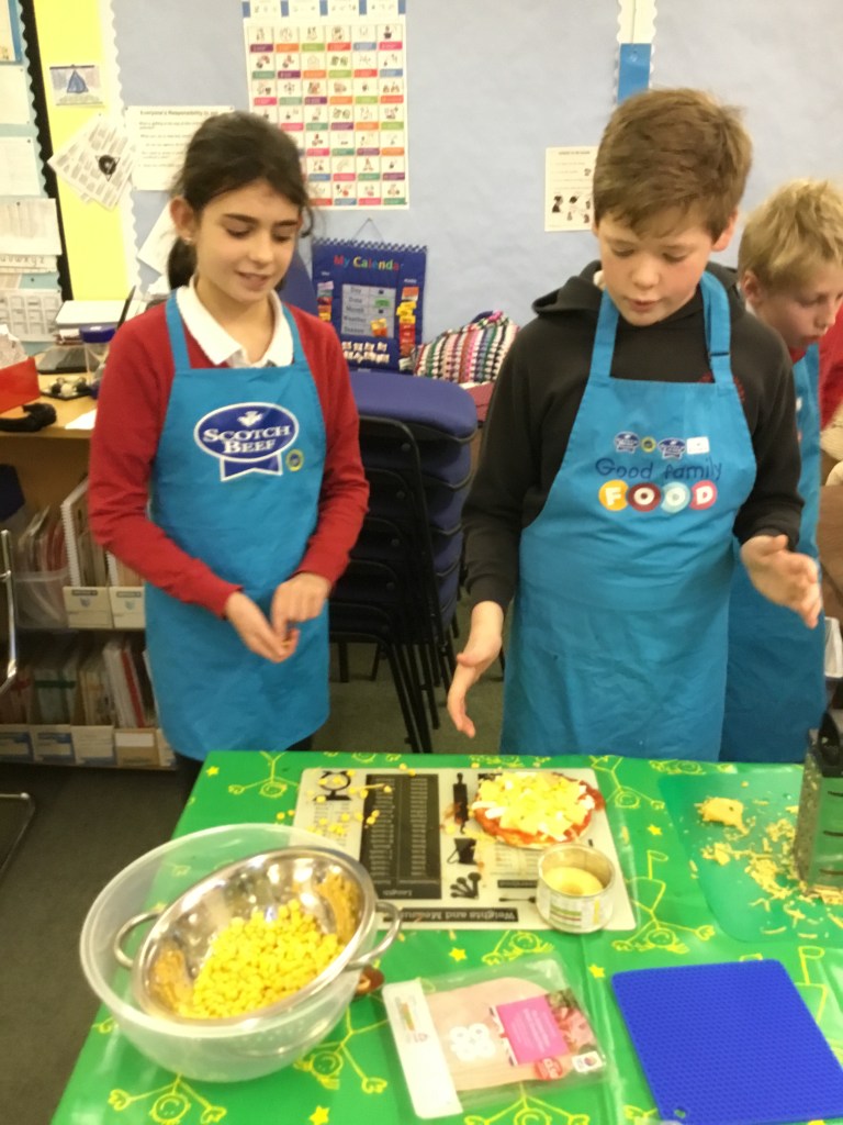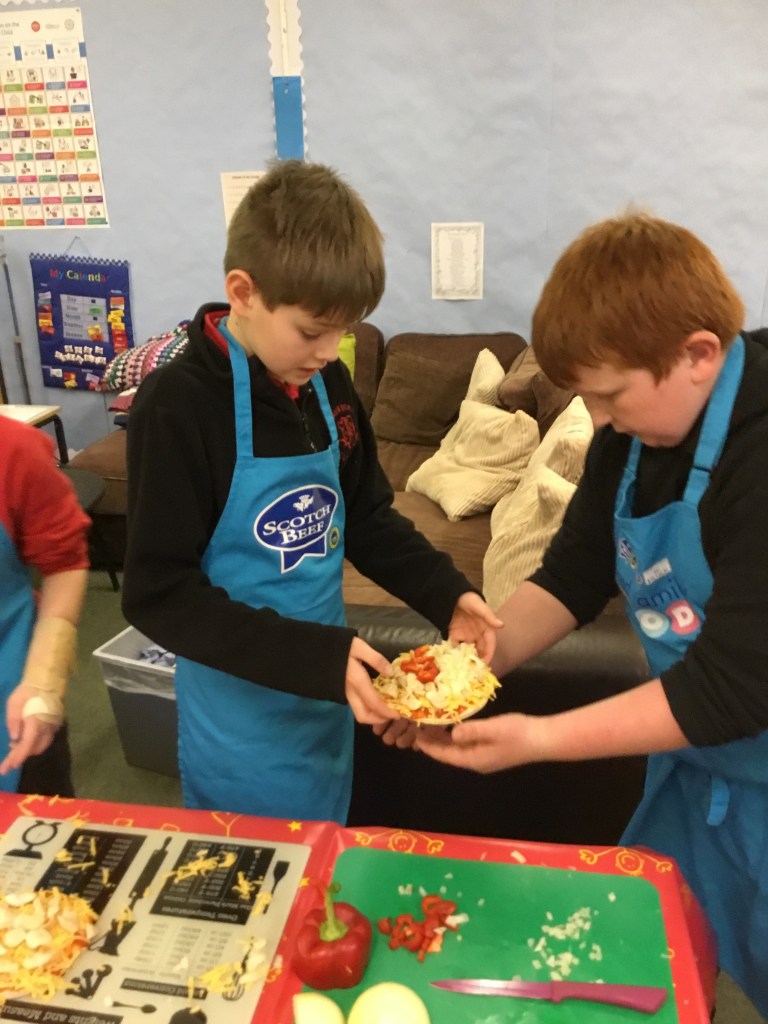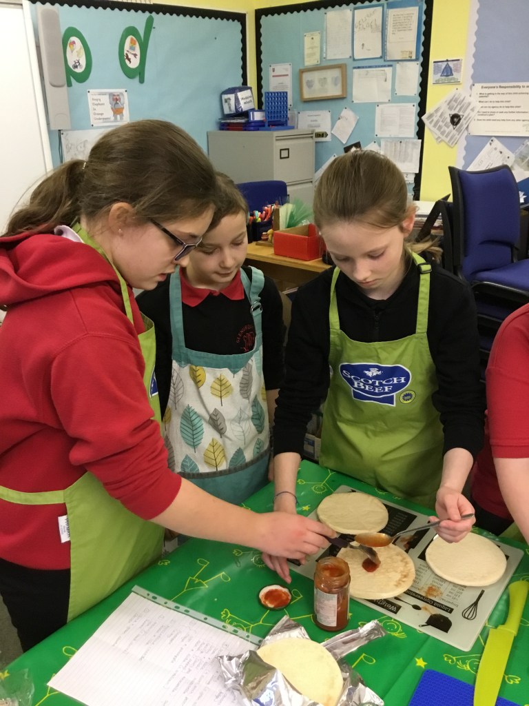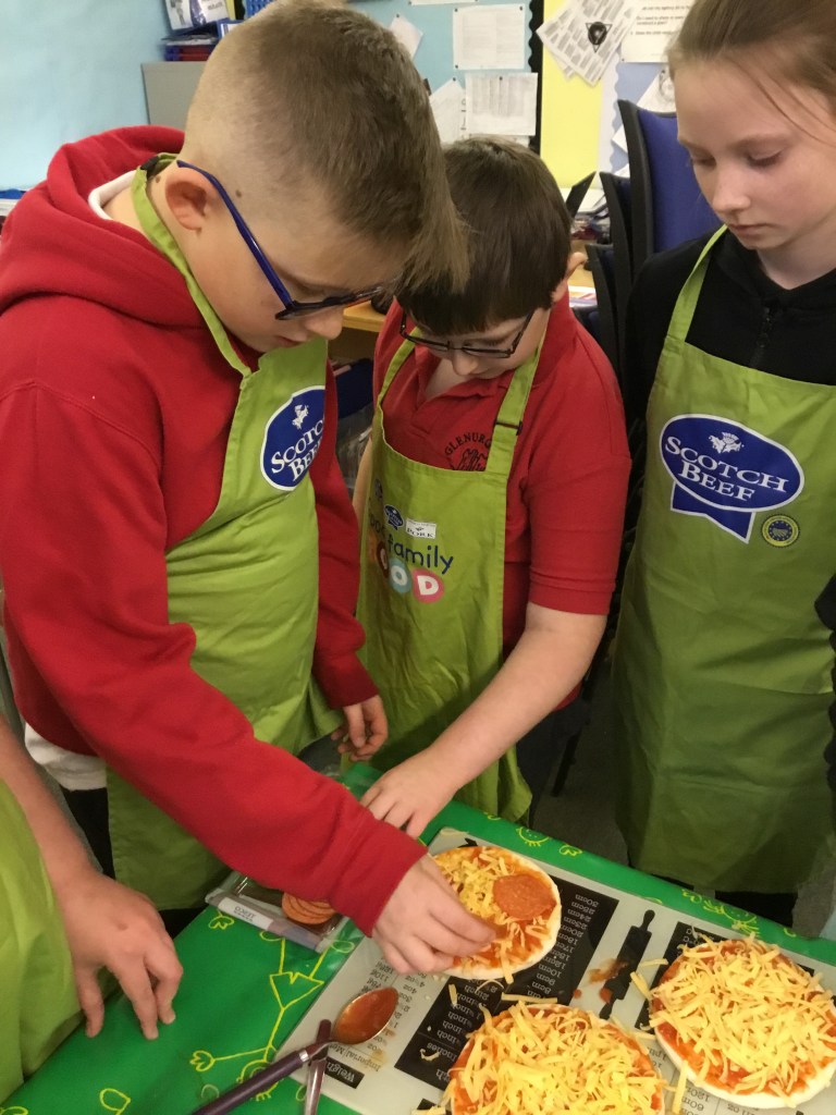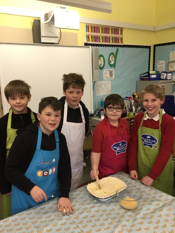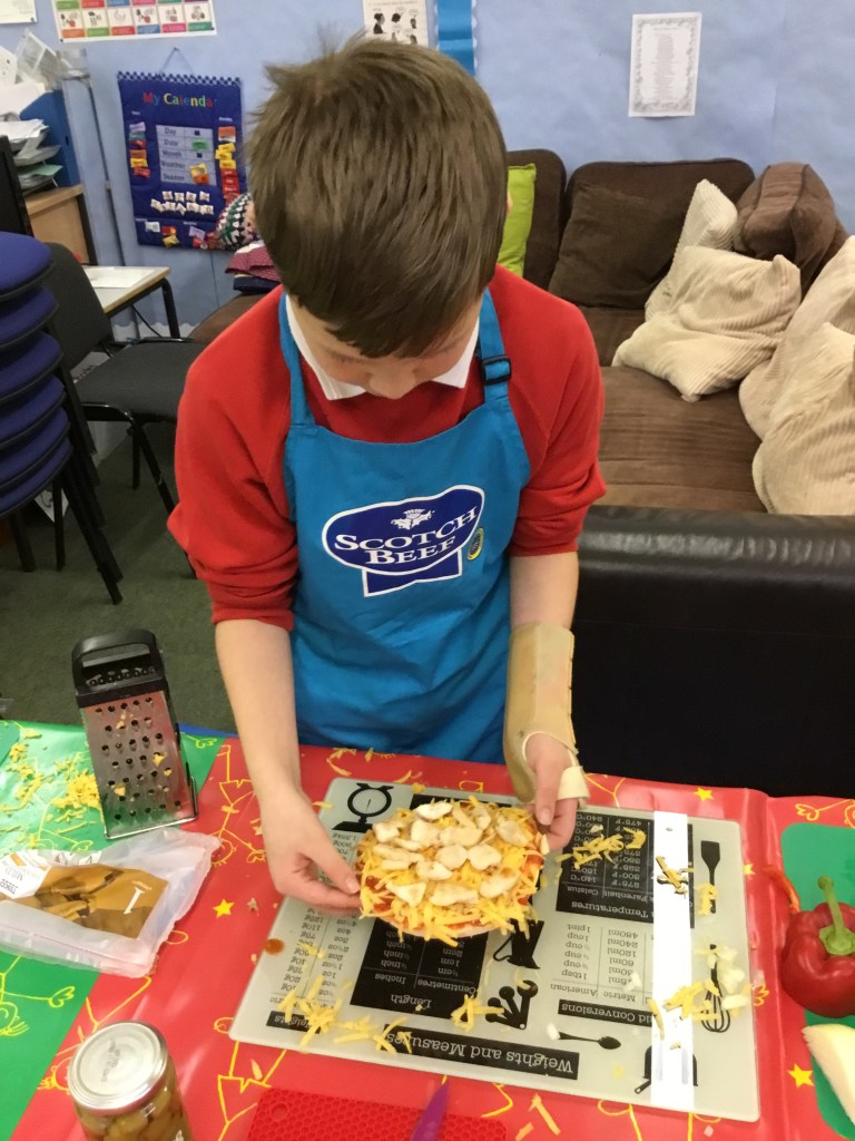 We had our last cooking session today with our final groups adding their pastry to the steak pies we started making yesterday. Everyone has now completed Salmon and Noodles, Lasagne, Stovies, Pizza and Steak Pie. We’ve had great fun while doing it. Next week we’ll consider all the things we’ve learnt since starting the cooking project. Have a look at our recipes on the page above and see if you can have a go at home!